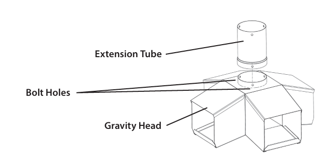 - Fit the Extension Tube to the top of the gravity head, aligning the 3 bolt holes. NOTE: Extension Tube can be left off if a higher feeding elevation is desired.