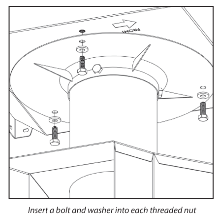 - The kit is now ready to be installed to your hopper. Rotate the kit so that the 4 feed chutes are all spaced evenly between the feeder legs. Align the (3) pre-installed mounting nuts in the bottom of the hopper with the (3) holes in the mounting plate, then secure the kit using (3) Hex Bolts and (3) Flat Washers. ONLY TIGHTEN AFTER ALL 3 BOLTS ARE INSTALLED (10mm wrench)