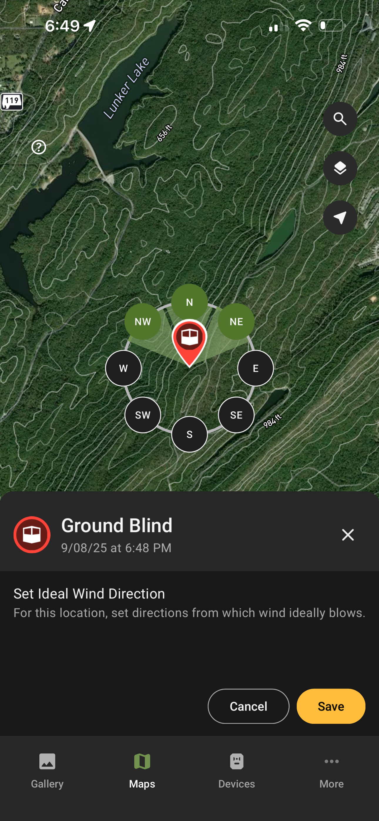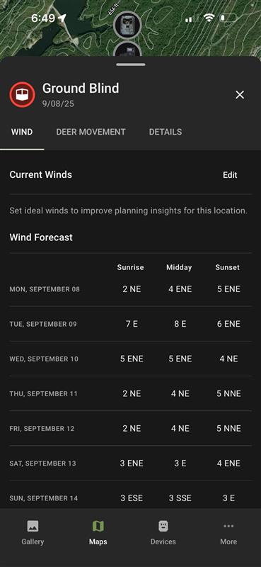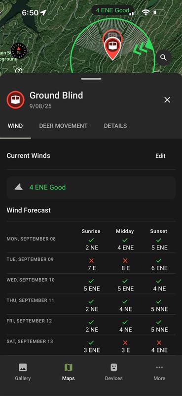 Hunt Prediction (plan): Look ahead using forecasted weather, wind, and your game plan data. Map pins switch to strategy icons—green check = ideal wind, gray = not ideal, ? = ideal wind not set. Pick a future date and time to see when conditions line up. If a pin is missing an ideal wind, you can set it from this view.